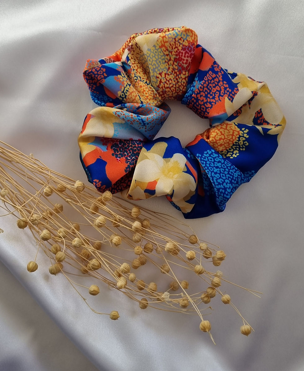Chouchou taille classique Satin Fleuri abstrait Bleu